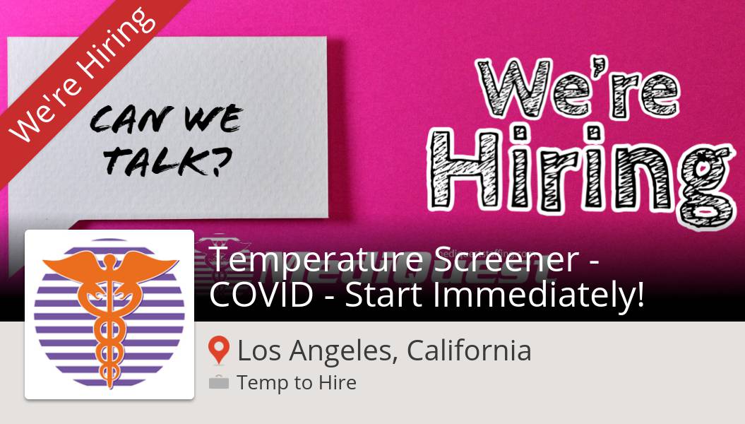 Temperature Screener jobs in Los Angeles CA All Filter 5 jobs within 15 miles. Leverage your professional network and get hired. MediQuest Los Angeles CA 1500 - 1800Hour Apply Now Job Details Company Overview A Full-Service Medical Group offering.